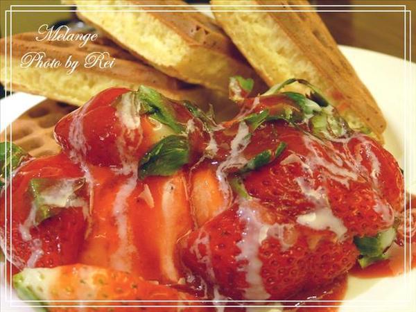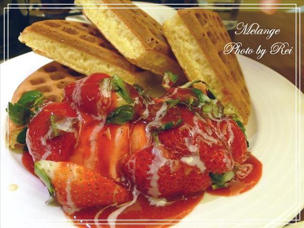 為了這期待已久的鬆餅,我們可是等了很久啦,上桌後,當然是要拍得開心啊。瞧這鬆餅,擺盤美麗。四塊切整齊的鬆餅,再擺上一球冰淇淋及奶油,放上草莓及果醬。不只是看起來美麗而已,鬆餅一口咬下真的很好吃喔,外皮烤的剛好稍硬,但又不致硬到刮牙齦。而內裡又很鬆軟,除了一般鬆餅就有的味道,也可以聞得到淡淡的奶香味耶,而且不沾醬就很好吃。果真要吃過好吃的鬆餅才知道為什麼要排隊啊~~